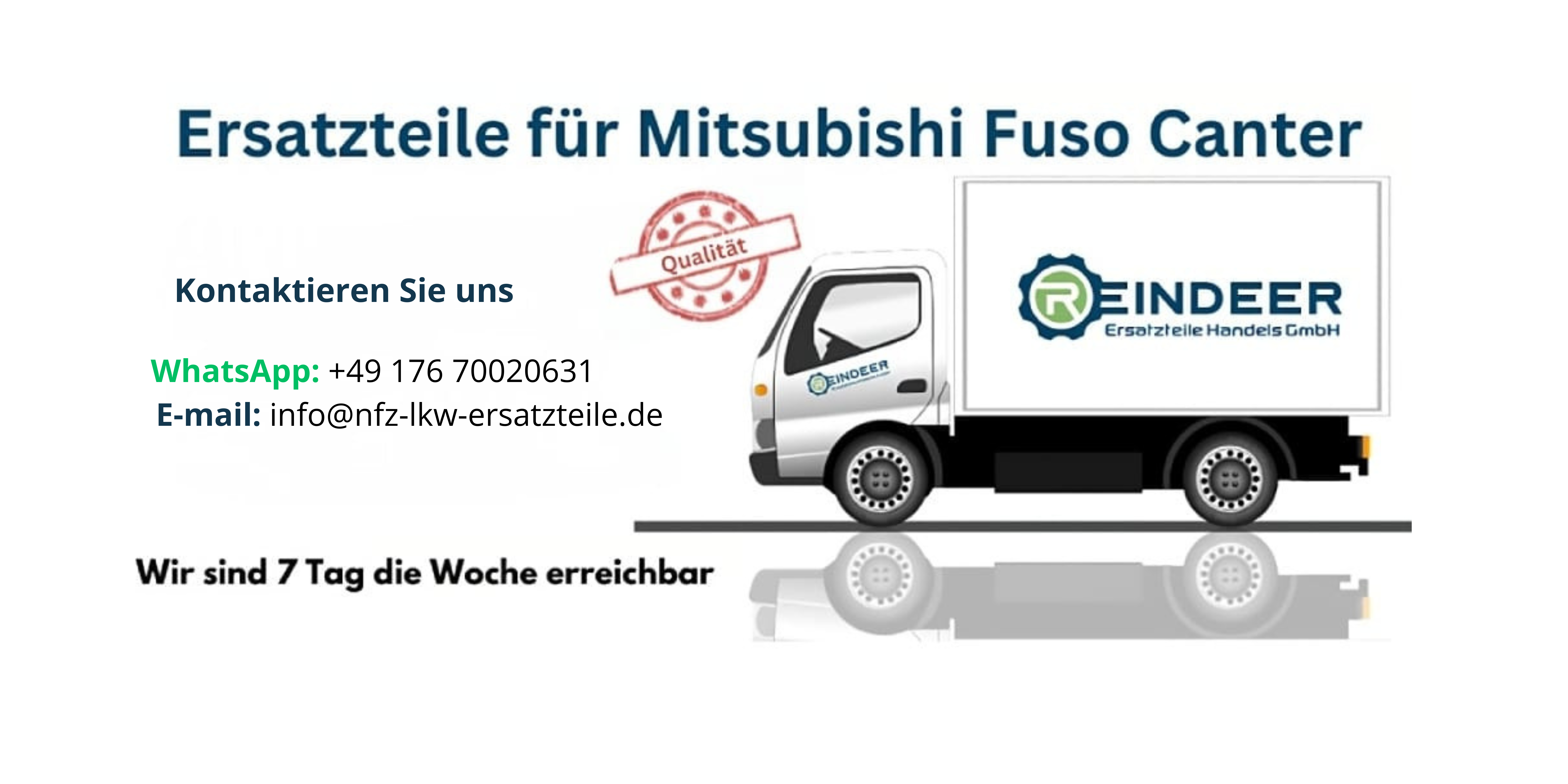 Reindeer Ersatzteile Handels GmbH bietet alle Ersatzteile für alle Modellen und Baujahren Mitsubishi Canter Fuso. Alle Ersatzteile sind in Japan hergestellt und weißen auf dem besten Qualität auf. Kontaktieren Sie unseren Spezialisten unter unseren Telefonnummer, Kontaktformular oder Email-Adresse. Wir sind täglich von 8 bis 18 Uhr offen. Wir prüfen alle angefragte Ersatzteile nach Passgenaugkeit mit Ihren Fahrzeug und stellen Ihnen Ihr persönliches Preisangebot innerhalb von weniger als 2 Stunden!